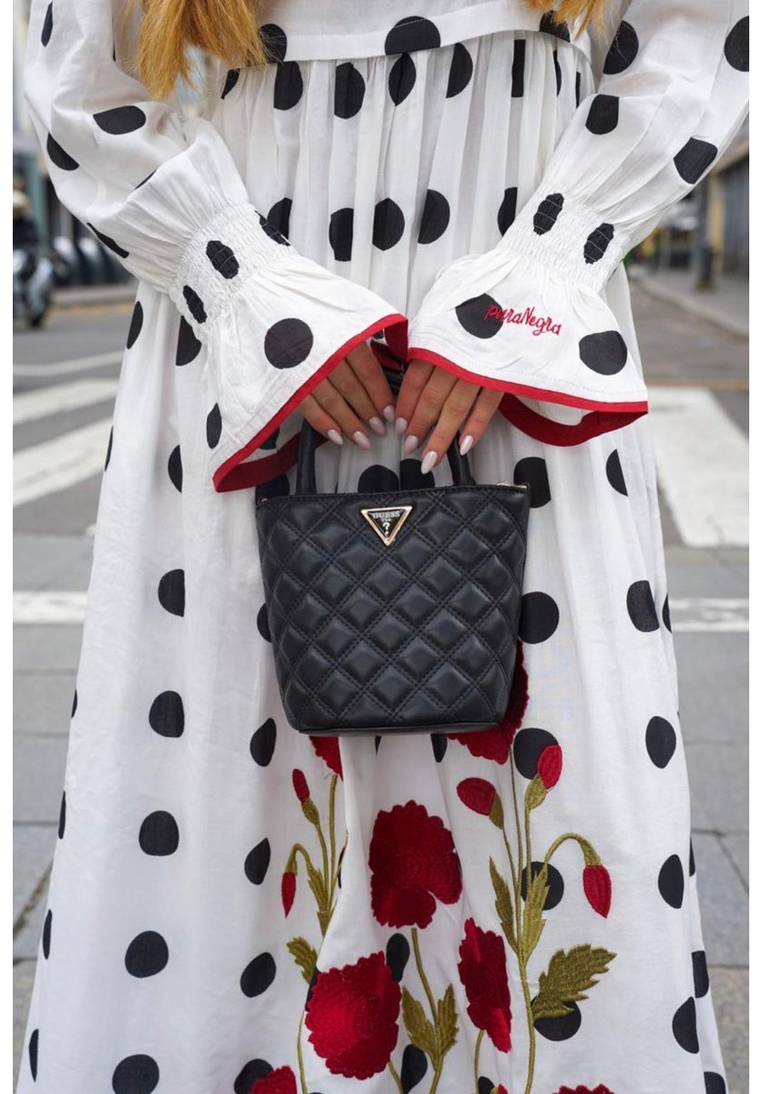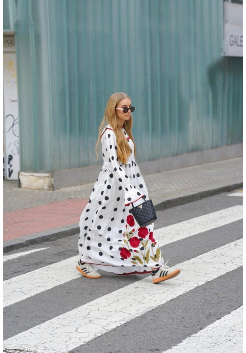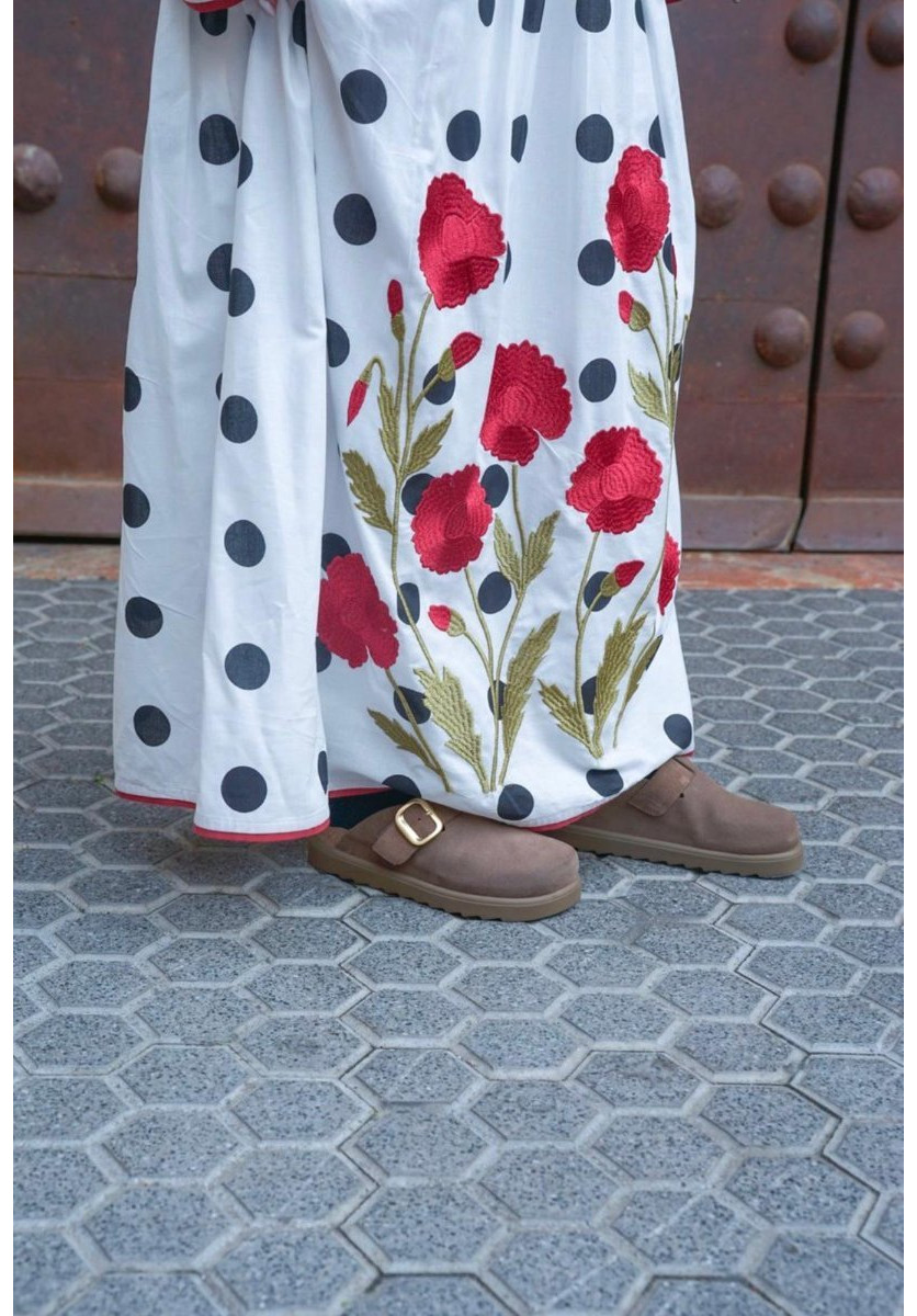 Vestido largo 100% algodón con estampado de lunares y bordado de claveles rojos.