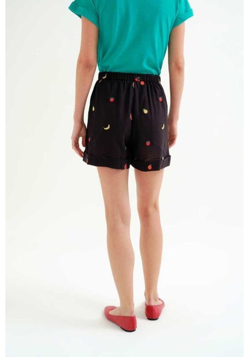 Shorts 100% algodón negro con bordado de Ensalada de frutas