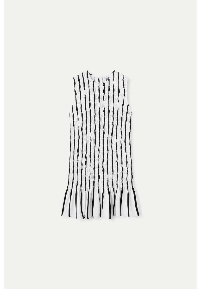 Vestido corto con tejido viscoso estampado grimaud white. Cuello redondo y sin mangas. Cierre posterior con botón. Detalles plisados. La modelo mide 173 cm y lleva la talla S.